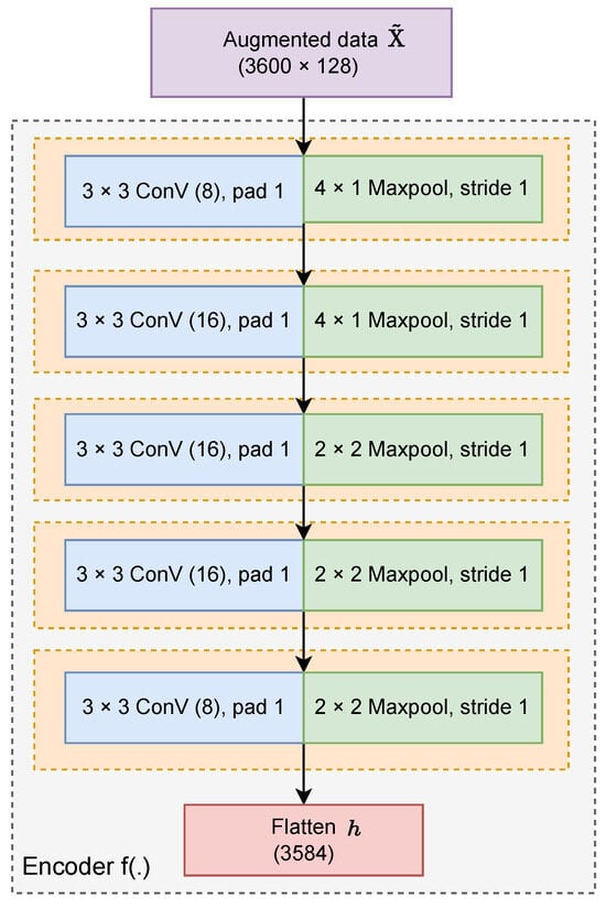 Figure 7 shows the structure of the encoder network, which comprises five convolutional blocks (each including a 3 × 3 convolution layer, a rectified linear unit activation and a max pooling layer) and a flatten layer with . After the encoder network, the projection head comprising a single hidden layer with and is used to apply nonlinear transformation and project to optimize the supervised contrastive loss in (6).