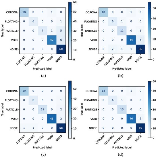 Figure 8 shows the confusion matrices for SVM, MLP, CNN, and the proposed SCL. It can be seen that both the proposed SCL and CNN only have two void samples that are misclassified as noise, while these metrics for the SVM and MLP are higher with the six and four misclassified void samples, respectively. In addition, the proposed SCL appears to be better than the other three methods in testing particle fault. As shown in Figure 8, the performance of the proposed SCL method is the best among four methods, with only a limited amount of the test data mistakenly recognized under other classes (one sample in the corona is misclassified as a void pattern, one sample in floating is misclassified as a particle, and two samples in void are misclassified as noise).