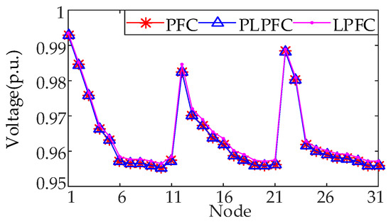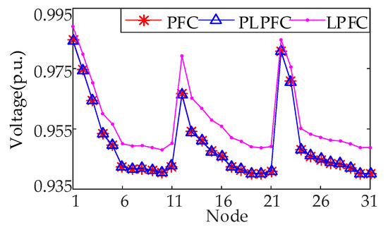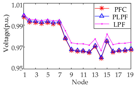 Next, the load power and PV output power were increased by 55% to analyze the circumstances with multiple overloaded VSCs. The VSC power calculation results are shown in Table 9. The VSC2 hits the capacity limit in the first round of calculations, and the VSC1 hits the capacity limit in the second round of calculations. The steady-state performance analysis was accomplished after three instances of LPFC. The maximum VSC power error of the proposed PLPF is 0.43%, which is less than 14.08% of the LPF. The voltage comparisons are shown in Figure 13, and the maximum voltage errors of PLPF and LPF are 0.04% and 1.27%, respectively. The simulation results prove the accuracy of the proposed PLPF when VSCs are overloaded.