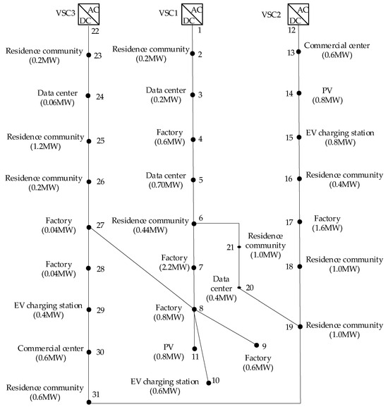 Figure 7 shows the DCDN in Suzhou, China. The VSC capacity was set to 5 MW; for the detailed parameters of the system, refer to [21]. The rated DC voltage was ±10 kV. The allowable voltage level was ±10% of the rated DC voltage. The VSCs were operated with a droop coefficient of 0.1 kV/MW and an operation reference power of 4 MW. The line parameters are shown in Table A1 of Appendix A. MATLAB 2022b with an Intel(R) Core(TM) i5-8350U CPU was used as the platform to implement the proposed strategy.