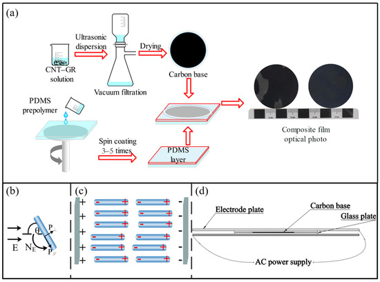 (a) Preparation of composite membrane experiment flow chart; (b) CNTs rotate in the direction of the electric field; (c) CNTs are arranged in the direction of the electric field; and (d) electric field orientation experimental diagram.