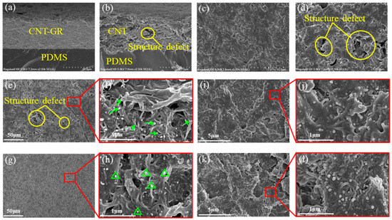 Comparing Figure 2e,g, the oriented CNTs–PDMS composite film is uniform, and there are almost no structural defects. Figure 2f shows that the orientation of carbon nanotubes in the CNTs–PDMS composite film is random. After the carbon nanotubes are oriented, they should be arranged along the direction of the electric field. However, because the carbon nanotubes are intertwined, it is not apparent from Figure 2h that the carbon nanotubes are completely arranged regularly. But the carbon nanotube ports (white endpoints) of the oriented CNTs–PDMS composite film are all upward, which proves that there is a tendency to align along the direction of the electric field. From Figure 2i–l, it can also be clearly seen that in the composite film with CNT:GR = 2:1 after orientation, more carbon nanotube ports are exposed, and the winding tendency becomes weaker. It proves that the electric field orientation has effect.