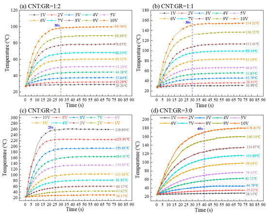 Composite films temperature–voltage response curve: (a) CNT:GR = 1:2, (b) CNT:GR = 1:1, (c) CNT:GR = 2:1, and (d) CNT:GR = 3:0.