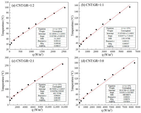 Power density–temperature fitting curve of composite films: (a) CNT:GR = 1:2, (b) CNT:GR = 1:1, (c) CNT:GR = 2:1, and (d) CNT:GR = 3:0. (The red line represents the fitting line and the black dots represent the raw data).
