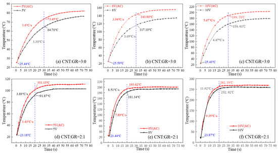 After the orientation effect of the electric field, it can be seen from Figure 7 that the heating rate of the composite film is increased by 1 °C/s, which is about 1.2 times that of the unoriented condition. This is because the effect of the electric field reduces the entanglement between the carbon nanotubes, making them more dispersed and connected, thereby reducing the insulating polymer layer between the contact points of the carbon nanotubes [50,51]. Reducing insulating polymer layer increases flow channels for electrons and phonons between carbon nanotubes in the case of the same voltage, thereby increasing the heating rate. For composite film containing only carbon nanotubes, directional action has a greater effect on the heating rate. It is attributed to the fact that the addition of graphene weakens the perturbation of carbon nanotubes.