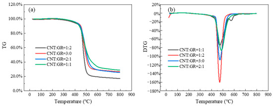 Figure 8 is the thermal stability analysis of the composite film. The decomposition temperature of the composite film is about 450 °C, as shown in Figure 8a. Under a nitrogen atmosphere, the decomposition temperature of PDMS film is about 400 °C, and it is wholly decomposed at about 600 °C [52,53]. Under a nitrogen atmosphere, the structure of carbon nanotubes and graphene is stable, and the weight loss ratio is minimal. The composite film quality changes significantly from about 450 °C and tends to be stable at about 600 °C, which is consistent with the TGA curve of PDMS. The decomposition temperature of the PDMS film with added carbon materials is somewhat higher compared with the PDMS film alone. It is considered that adding carbon nanotubes and graphene leads to stronger interactions between PDMS molecules and carbon materials. Dense chain packing at the interface interacts with PDMS, and the chain motility in the PDMS matrix is reduced [54,55]. Since the added carbon materials are different proportions of carbon nanotubes and graphene with the same mass, the interfacial interaction between the filled carbon materials and PDMS molecules is the same, so the decomposition temperature points of composite films with different proportions of carbon materials are the same, and there is no effect on the thermal stability [56]. From the comparison of the weight loss rate of each proportion of composite film in Figure 8b, it can be found that the three-dimensional structure composed of graphene and carbon nanotubes is more conducive to the structure stability of the composite film. This is because the synergistic effect of carbon nanotubes and graphene makes the network of internal materials more complex, enhancing the intermolecular forces of PDMS [57]. This leads to a tighter internal structure of the composite membrane and a decrease in its decomposition rate. Therefore, appropriately mixing graphene in carbon nanotubes can reduce the weight loss rate of the composite membrane and improve the thermal stability of the composite membrane to a certain extent.