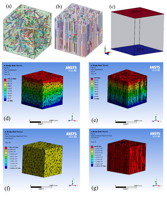 RVE model of (a) CNTs–PDMS composite film; (b) oriented CNTs–PDMS composite film; (c) schematic diagram of heat conduction; temperature distribution of (d) unoriented carbon nanotubes; (e) oriented carbon nanotubes; total heat flux of (f) unoriented carbon nanotube composite film; and (g) oriented carbon nanotube composite film.