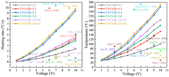 The maximum heating rate of the composite membrane in this study is 9.7 °C/s, and the maximum stable temperature is 269 °C. As shown in Figure 10, the electrothermal performance of the composite film in this study meets the requirements of current common research fields. Different proportions of composite films can be selected based on the temperature requirements of specific application scenarios, and the output temperature can be adjusted according to the voltage. Application of insulation for transportation pipelines such as gas under low temperature conditions; deicing of car and aircraft window glass heaters; wearable electronic devices such as electric heating gloves, knee pads, constant temperature masks, and constant temperature warm clothing; embedded in walls or floors for building insulation; and heating and insulation in industrial production.