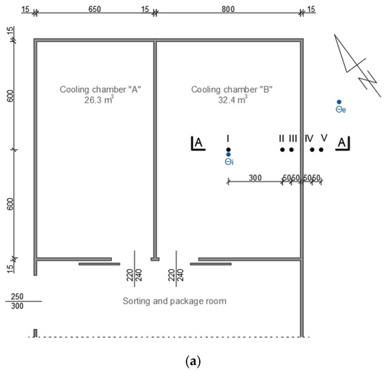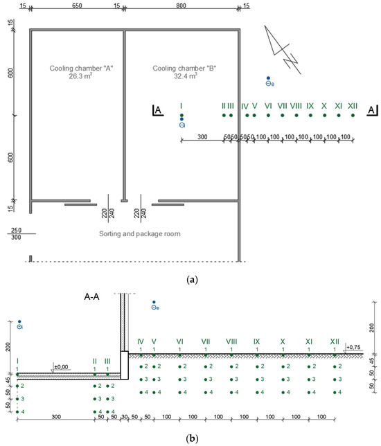 The study was conducted at a cold storage facility located in the southern part of Poland. The studied facility has a room layout with a sorting and packing room located at the head of a row of two cold storage chambers. The building has a steel frame structure, set on a 30 cm wide concrete foundation, founded at a depth of 1.0 m below ground level. The fact that the foundations are not thermally insulated is important in terms of ground heat exchange. The floors of the chambers are made of 10 cm thick cement screed and have 4 cm thick thermal insulation made of hardened polystyrene. The organoleptic examination of the soil showed that there is a 40 cm layer of humus in the surroundings of the cold storage, with clay loam deposited underneath, with a thickness of 1.5 m. The external walls and ceiling of the chambers are finished with sandwich panels, made of steel sheets, galvanized and painted on both sides, along with a 15 cm thick polystyrene core. Polyurethane foam was used to eliminate thermal bridges at the joints of the cladding panels. The tested building was uncovered (no shading). There were no other buildings located in its vicinity that could cause interference in the measurement results. As a result of the conducted research, no groundwater was found at a depth of 3.0 m below the ground surface.