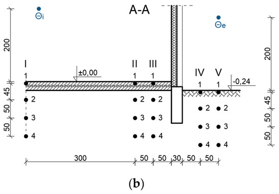 Distribution of measurement points in the studied object: plan (a), cross-section (b); I, II, III, IV and V—measurement pipe and points (black spots); Өi—interior temperature, Өe—interior temperature (blue spots).