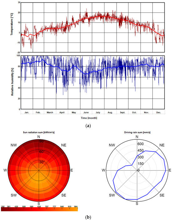 Characteristics of a typical meteorological year (TMY) used in the numerical analysis: air temperature and humidity (a) and solar radiation intensity and annual precipitation (b).