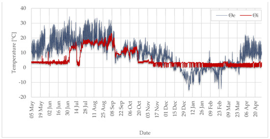 The course of outdoor air temperature (Θe) and indoor air temperature (Θi).