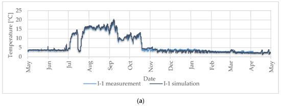 The verification of the validation and calibration of the computational model showed high convergence between the actual and theoretical data (Figure 7). A maximum error of 6.5% was specified for all measurement points (monitors), with a mean value of 4.1%. The best match between the actual and theoretical data was found for point I-1, which represents floor temperature (2.1%). The data obtained allowed a positive reliability assessment of the theoretical data obtained. The CV rate (RMSE) was met in terms of the FEMP 3.0, ASHRAE G14-2014 and IPMVP criteria. The NMBE indicator was met in terms of the FEMP 3.0 and ASHRAE G14-2014 criteria. For the IPMVP criterion, there were slightly exceeded limit values (up to 1.5%) recorded at points IV-1 and V-1. This was found to be due to a certain limitation of the numerical model, which is the inability to take the variability in the snow cover around the building into account under non-stationary conditions.