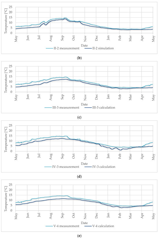 A correlation analysis was performed for the simulation results and measurements obtained from all measurement points, based on Spearman’s rank test (the data did not have a normal distribution). The results for selected measured and theoretical points are shown graphically (Figure 6). The highest value of the correlation coefficient (0.95–0.99) was found for points V-2, V-3, V-4, IV-2, IV-3, IV-4, III-2, III-3, III-4, II-2, II-3 and II-4, as well as I-2, I-3 and I-4. Thus, it can be concluded that at depths of 0.50 m, 1.00 m and 1.50 m, there was a complete match between the measured and calculated data. For points V-1 and IV-1, located 0.05 m below the ground surface, and I-1, II-1 and III-1, located below the floor surface, the value of the correlation coefficient was in the range of 0.85–0.88. The match between the measured and calculated data at these points should be considered very high.