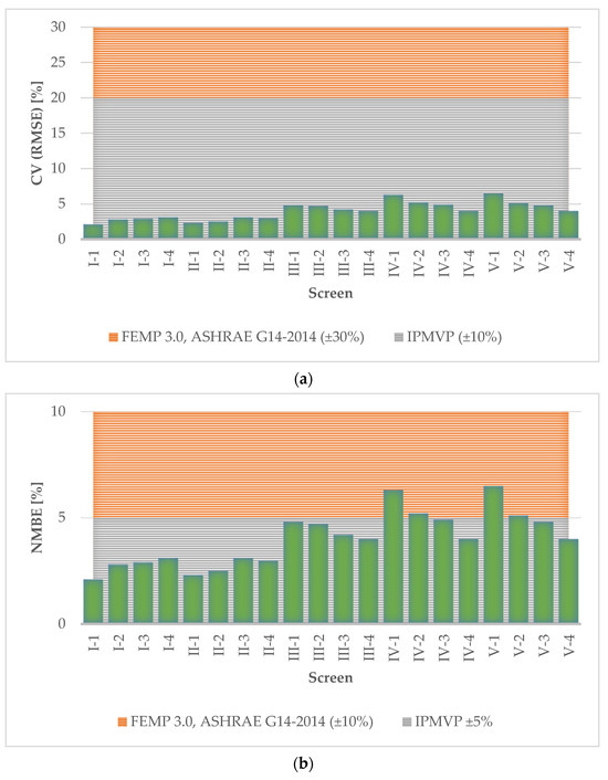 Verification of the computational model validation with respect to the CV(RMSE) uncertainty index (a) and NMBE (b), based on FEMP 3.0, ASHRAE G14-2014 and IPMVP criteria.