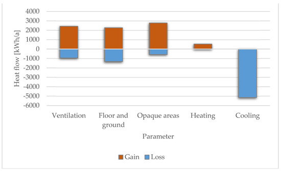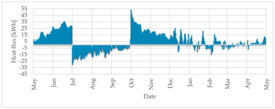 Analysis of the ground heat exchange balance on an annual basis showed high energy gains of 2055 kWh. The total energy demand for cooling was 1723 kWh, while it was 1204 kWh for heating (Figure 11).