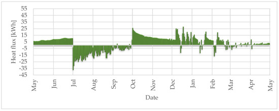 The results of the numerical analysis of the cold store, with the floor recessed into the ground, showed an increase in the contribution of the ground to the energy balance of the cold store, compared to the existing state. On an annual basis, the land’s share of the energy balance in this case was 33%. The highest value of heat gains occurred in October, at 892 kWh (Figure 10).
