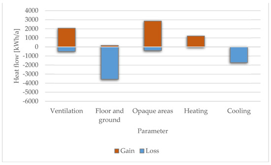 Among other things, the performed numerical analysis allowed us to determine the formation of heat exchange with the ground and the energy balance of the studied cold storage. In the existing state, the total energy demand for building cooling was 5141 kWh, while for heating purposes, it was 527 kWh (Figure 8).