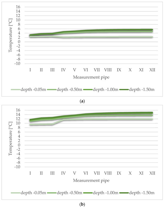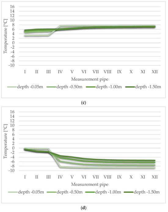 For each of the transitional periods analyzed (spring and autumn), it was found that the extent of cold storage’s impact on the surrounding ground did not exceed 4.0 m. In the winter period (February 2), it was possible to observe a drop in the temperature of the ground lying under the floor below 0.0 °C. Thus, the cooled floor and the ground under the cold storage in the autumn period may contribute to its freezing in the winter. In winter, there was an increased impact of cold storage with recessed floor on the surrounding ground compared to the fall and spring periods. In February, the range was found over a 6.0 m section at a depth of −1.50 m.