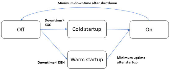 The minimum output limit outlined in Equation (5) is associated with Equation (32), which equals 1 to accommodate either a hot or cold startup of a steam turbine. Following this logic, for a hot or cold startup of a steam turbine, the term equals zero. This allows the output of the steam turbine to match the output value determined for each respective thermal status startup.