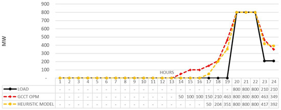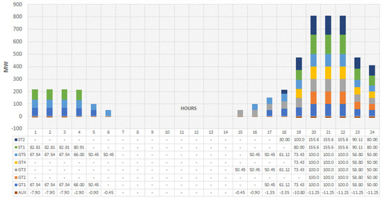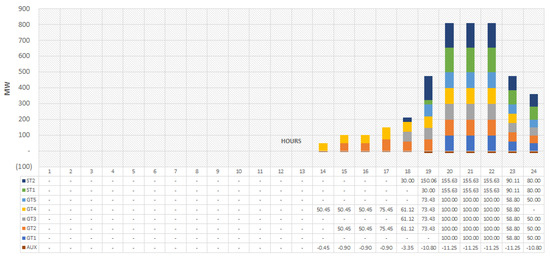 For periods when the CCGT is deemed to be in a ‘cold’ thermal state (), the programmed generation conforming to the startup ramp is governed by Equation (28). This constraint integrates two components: the first delineates the ‘warm’ energy blocks that began to be applied in the ‘cold’ state, and the second represents the fixed augmentation blocks to make the ‘cold’ startup.