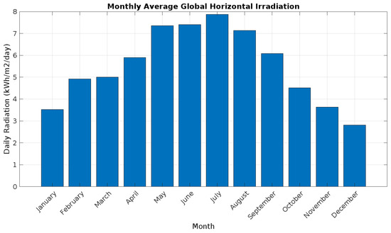 The solar radiation reaching the surface can be expressed through various metrics. Global horizontal irradiance quantifies the total shortwave radiation received from above by a surface positioned horizontally to the ground; this metric holds significant relevance for PV installations, as it encompasses both direct normal irradiance and diffuse horizontal irradiance. The annual average solar irradiation of the site has been extracted from the Homer Pro database. Figure 2 depicts the monthly average global horizontal solar irradiation in Fez. The results shows that the site is rich with solar potential, with an average of 4.97 kWh/m2/day.