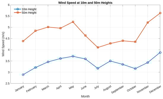Wind speed measurements have been taken at potential bus charging stations and bus terminals, specifically at heights of 10 m and 50 m, as illustrated in Figure 3. As per the information provided by the EIA [36], suitable locations for wind turbines are characterized by an annual average wind speed of at least 4 m per second (m/s) for small wind turbines and 15.8 m/s for utility-scale turbines; ideal sites encompass elevated, smooth, and rounded hilltops, expansive open plains, bodies of water, and mountain gaps that effectively channel and intensify wind. Figure 3 provides wind speed data at 10 m height in Fez, ranging from 2.85 m/s to 3.87 m/s, and at 50 m height, ranging from 4.43 m/s to 5.58 m/s. The analysis concludes that, at the 10 m height, the wind speed falls short for optimal wind electricity generation in Fez. Therefore, a wind turbine with a height of 50 m is recommended to harness more favorable wind conditions.