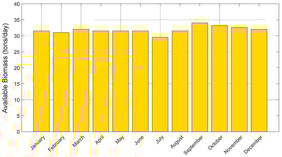 The assessment of biomass potential in Fez relies on the research conducted by Bendaoud et al. [37]. Their findings indicate that the Fez-Meknes region is abundant in various forms of biomass and waste, including olive residues, vegetable waste, and wood. Table 4 quantifies the agricultural biomass, mainly olive residues, cereals, vegetable waste, legumes wastes, and woods, in the province of Fez. The study conducted by Bendaoud et al. [37] relied on official reports and documents from public institutions within the region. According to the gathered data, the annual quantity of waste generated in the Fez-Meknes region is estimated to be approximately 2,057,410 dry tons/year [37], with the yearly potential for olive residue in the city of Fez alone being around 9650 tons per year. The monthly availability of biomass resources in this area is illustrated in Figure 4.