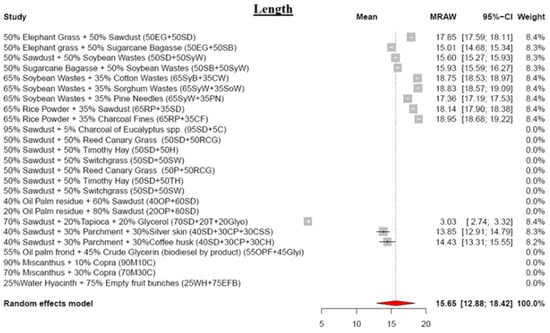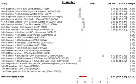 In the meta-analysis, the mean pellet diameter was found to be 6.37 mm, with a corresponding mean length of 15.65 mm (Figure 2 and Figure 3). These mean values comply with the stipulated diameter and length requirements outlined in the pellet standards for both domestic and industrial purposes. An intriguing observation is that the pellet diameters manifest higher values than the die holes from which they are produced. The existing literature posits several possible reasons for this phenomenon. Scatolino et al., 2017 [] proposes that the change in pellet size may be attributed to water filling the voids within the pellets, disrupting the bonds formed during the pelletization process. Additionally, this could be the result of particle rearrangement upon the release of compression force, compounded by the varying moisture content of the raw materials [,]. Furthermore, the literature suggests that pellets with smaller diameters exhibit a more uniform combustion rate compared to larger diameter pellets, attributed to the greater exposed surface area, facilitating efficient combustion [].