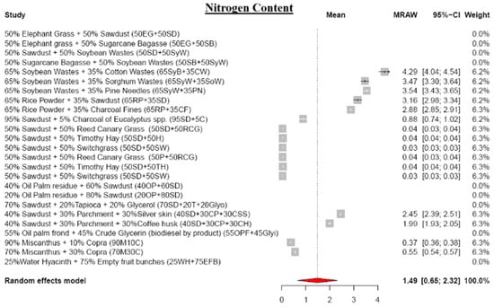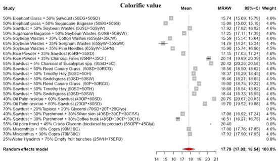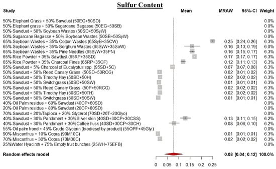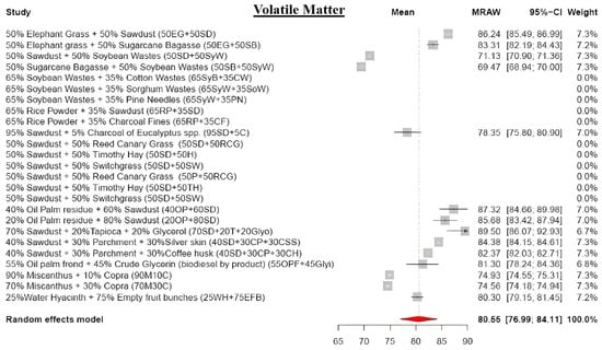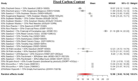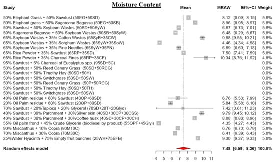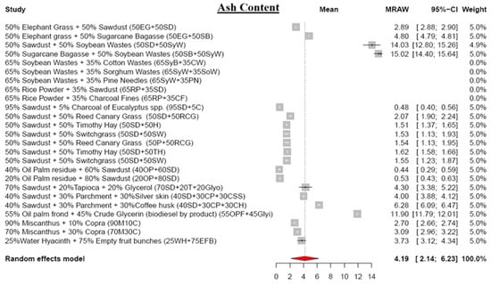 The meta-analysis reveals lower moisture content (MC) values in blended biomass pellets, averaging 7.48% (Figure 4). The final MC depends on the raw material types and their blending ratios in the pellet production. For instance, a blend of 65% soybean waste and 35% cotton waste yields pellets with a 9.88% MC, whereas substituting cotton waste with sorghum waste reduces the MC to 4.46% []. MC exhibits a positive correlation with sawdust content but a negative relationship with herbaceous biomass materials [,,], showcasing its intricate dynamics in blended biomass pellets. Notably, the MC significantly influences calorific value, combustion behavior, and efficiency, and fosters mold growth [,].