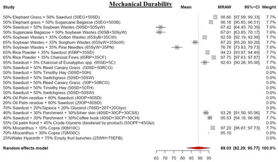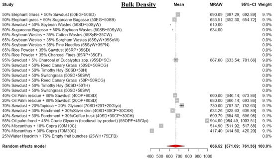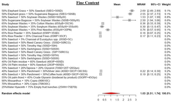 From the 186 selected studies, a set of 19 research studies containing test results for pellet quality parameters was extracted for meta-analysis. Although the remaining 167 studies were excluded from the meta-analysis, they were utilized as literature sources to gather relevant information and factual data for composing the SLR. To conduct the meta-analysis, parameters such as the number of test cycles (n), the mean of the test results (mean), and the standard deviation of the results (SD) were required. Studies lacking n, mean, and SD were excluded from the meta-analysis. The meta-analyzed results were presented in forest plots, and a comparison of each parameter with pellet standards was performed.