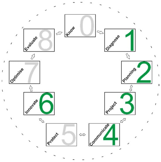 FACIIL brings together a qualitative component, continuous improvement, and a quantitative component of decision support. The qualitative component includes the Know, Diagnose, Plan, Design, Communicate, Protect, Innovate, and Optimize phases. The quantitative component considers the four vectors Information Technologies, Financial, Environmental, and Social, and, for each vector, a set of dimensions that gather, in turn, the relevant indicators []. In this article, only the results of the Environmental vector were demonstrated.