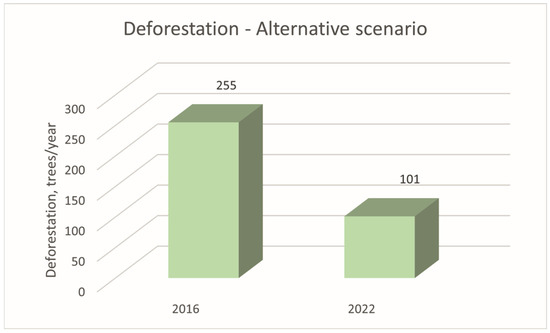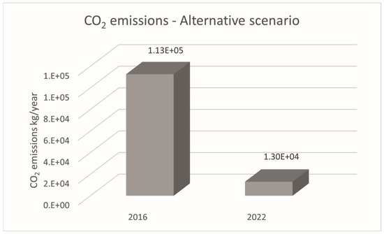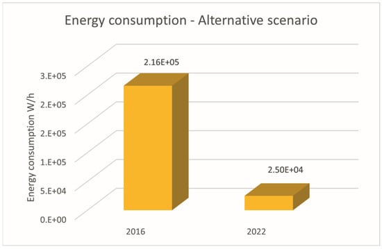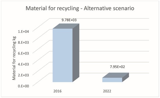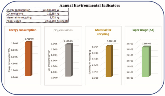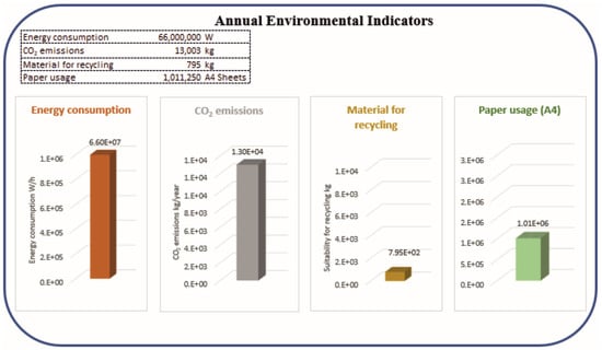 Figure 16 allows the observation of four environmental indicators related to the year of the project’s start, 2016, where you can see the values of energy consumption, CO2 emissions, suitability for recycling, and use of paper, values that are quite high compared to those of 2022.