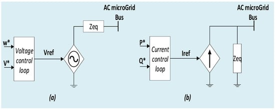 The amount of renewable energy generation systems that are connected to the grid is continuously increasing. Consequently, the presence of power electronics devices in power systems has also increased. At present, the electrical grid is predominantly characterized by synchronous generators (SGs). These generators provide a consistent voltage and frequency, facilitating the synchronization of VSIs and their connection at the point of common coupling (PCC) for injecting power into the main grid. These inverters operate as current sources and are known as grid-following inverters. The imperfections of grid-following inverters arise when the grid is absent, as this concept fails to produce instantaneous voltage and frequency set points. Therefore, this operating mode has been significantly modified, from following the grid to leading it. This concept is known as grid-forming (GFM) inverters, which can independently set up and keep the voltage and frequency within their nominal ranges without the need for the main grid []. The block diagram of both concepts is depicted in Figure 1.