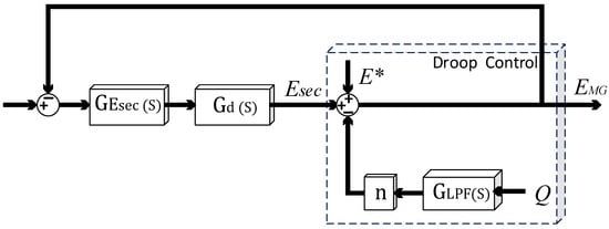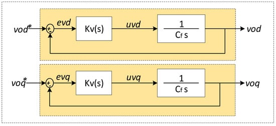 where and are the virtual resistance and inductance value and are the virtual voltage compensation and output current in dq—reference frame, respectively. The closed-loop modeling and the stability analysis of the virtual impedance loop have been studied in previous works [,], and will not be addressed here.