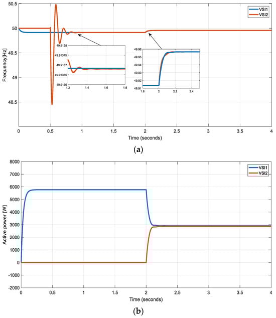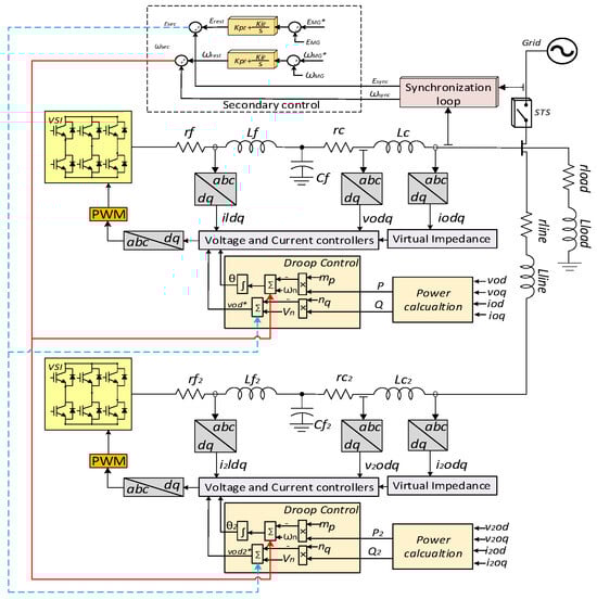 In order to equally share the power between the GFM inverters and to ensure the power flow, the reference of the voltage control loop vref is provided by the decentralized control that comprises the droop controller and the virtual impedance loop. The amplitude and phase of the voltage reference are generated by the droop control according to the measured active and reactive powers. The droop functions can be expressed as follows []: