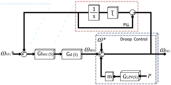 To design the frequency restoration controller gains and to ensure system stability, the model depicted in Figure 11 is used. It consists of three main blocsk; the droop control block to determine the MG frequency, a reduced first-order PLL model to measure the MG frequency, and the secondary control compensator Gfsec(s) associated with a delay transfer function Gd(s) to mimic the communication line delay. From the developed model in Figure 10, the transfer function can be obtained as follows: