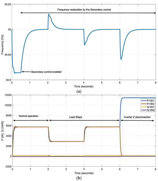 The secondary control is introduced to compensate for the steady-state error caused by the droop control deviations after load connection to meet the grid standard. In this work, a centralized topology is adopted to allow the GFM inverters to compensate for the frequency and voltage set points, as expressed as follows []: