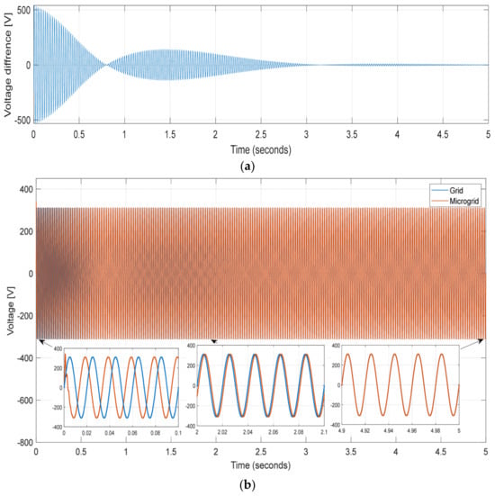 Synchronization process (a) voltage difference (b) Grid and MG voltages.