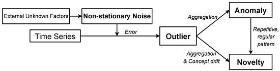 The relationships among non-stationary noise, outliers, anomalies, and novelties.