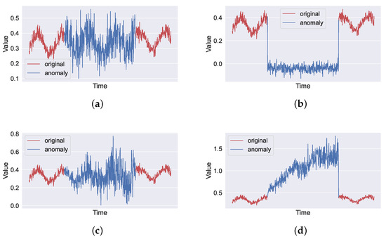 Figure 4 illustrates examples of the synthetic anomalies. Note that an anomaly with gradually decreasing variance is generated if the temporal factor in Equation (16) is replaced with , where refers to the duration of the anomalous sequence.