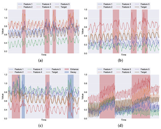 Visualization of synthetic anomalies added to the artificial time series. (a) Pattern I (see Equation (14)). (b) Pattern II (see Equation (15)). (c) Pattern III (see Equation (16)). (d) Pattern IV (see Equation (17)).
