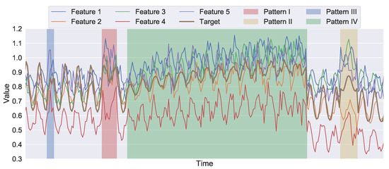 Under Setup I, five experiments were designed based on the artificial time series, with the first-year data as the training data and the second-year data randomly modified by the generated anomalous sequences for anomaly detection assessment. Each of Experiments I-1, -2, -3, -4 contains the anomalies generated by a single pattern from I to IV. In Experiment I-5, anomalies from the four patterns are mixed, and anomalies from the same pattern are intentionally introduced regularly to the second-year time series for novel pattern clustering, as illustrated in Figure 5. The anomalous samples account for 10% of the whole test data in each experiment.