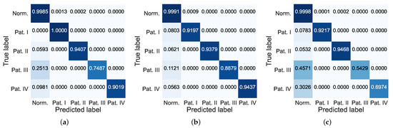 Confusion matrices of anomalous segment clustering results for Experiment I-5 using (a) MCDHDNN. (b) VEHDNN. (c) VEHLSTM. Darker colors indicate higher performance of the model in the category.