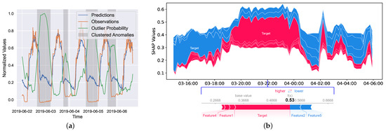Figure 7a shows a fragment of unlabeled photovoltaic inverter data, where the unlabeled anomalies detected by PrOuD are marked with light gray blocks. We can observe that the curve of the outlier probability changes rapidly, indicating its sensitivity to the abnormal data. In addition, our clustering algorithm grouped them into the same anomalous pattern and marked them in the same color. The recurrent anomalies may imply the occurrence of a novelty. In fact, the valley of the observation curve in these blocks is lower than what we observed in the training data. According to our definition given in Section 3.1, the aggregation of these anomalies from the same pattern can form a novelty. The novelty should be incorporated into the current model to extend its knowledge. Unfortunately, even domain experts may not be aware of the existence of a novelty when they label the data. Figure 7b displays the SHAP values of the second anomaly (on the evening of 3 June) in Figure 7a and of an outlier within the same anomaly. The length of each bar corresponds to the quantified score indicating the contribution of the respective channel to the overall outlier probability (0.53 in this case). The red bars indicate channels that increase the outlier probability, while the blue bars indicate channels that decrease this probability. The channel with the longest bar, i.e., the target channel in this case, is the root cause of the outlier according to SHAP. This fits our analysis that a lower valley of the observation curve leads to the anomaly.