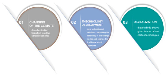 The world economy is developing in the age of the fourth energy transition, which sees advanced production and digital technologies, the economic attractiveness of new energy sources on the one hand, and the emergence of qualitatively new factors—decarbonization trends and the fight against global climate change—on the other. The emergence and active growth of technological and digital innovations on both the generation and consumption sides of the energy sector are leading to a gradual but deep transformation of the entire fuel and energy sector (FES) [1,2,3,4].