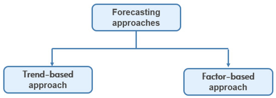 In order to produce energy generation mix forecasts, predictive analytics methods based on available historical and current data should be used. Depending on the completeness of the data and the required forecasting horizons, different approaches can be used for forecasting: trend or factor-based approaches or their combinations [25,26] (Figure 2).