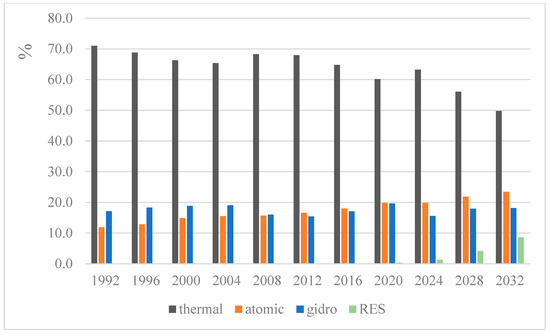 The dynamics of changes in the structure of energy generation in the Russian Federation imply a change in the ratio of electricity generation by different types of power plants. The resulting forecasts allow us to make assumptions and adjust strategies and policies that describe the future of the fuel and energy complex. The goals set by the state energy development program [30] directly affect the consequences of the energy transition. The forecasts below correlate with the Energy Development Program policy. The results presented in the paper are a forecast of the energy transition that takes into account the trends reflecting its main goals. It should be noted that, in accordance with the goals of energy transition, the forecasts made with this model consider the quantitative restrictions imposed on the dynamics of hydrocarbon consumption.