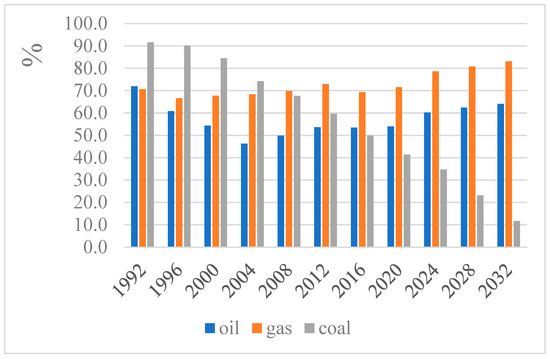 The trend of reducing coal consumption, as the most carbon-intensive fuel in terms of greenhouse gas emissions, will lower the rate of climate change. Also, a large share of coal is exported to countries where the energy system based on coal-fired thermal power plants (TPP) has a privileged position. Yet, the development of new oil and gas complexes in the Arctic and Far East will stimulate domestic consumption of petroleum products and natural gas. Another factor affecting the need for natural gas is the regional gasification program [31] and the modernization program for coal-fired thermal power plants.