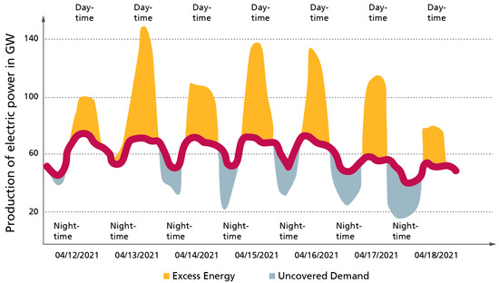 In Figure 1, the measured power output of renewable energy generation in Germany of the 15th week in 2021 is shown, multiplied by factor of 4.5. This ensures that the integral of the energy production by PV and wind covers the assumed consumption (red line) in the year 2040. A huge surplus during daytime (orange areas) and a lack during nighttime can be seen.